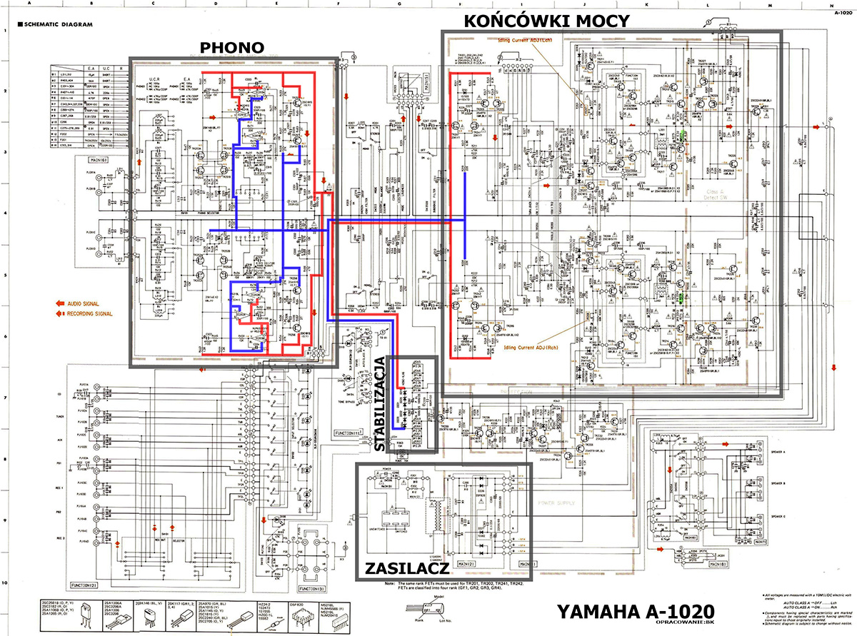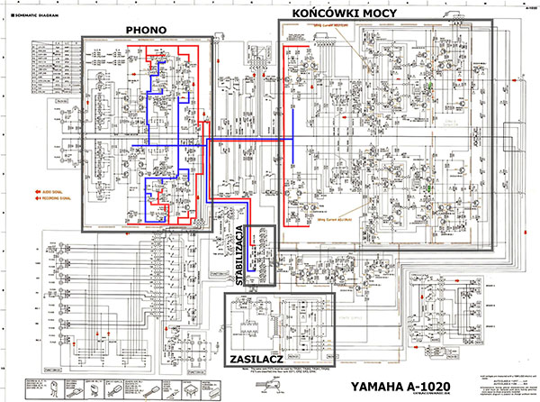 Przyjrzyjmy się wiec budowie wzmacniacza Yamaha A-1020, gdzie w/w układ występuje i zobaczmy które części układu wzmacniacza, zasilane są z tego właśnie źródła: