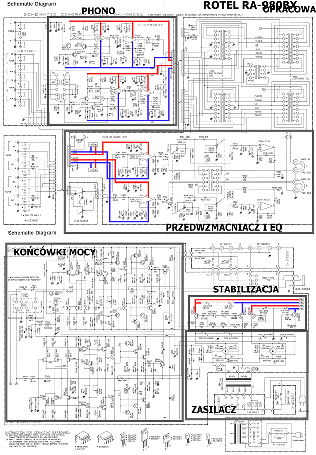 Przyjrzyjmy się więc wzmacniaczowi Rotel RA-980BX, by sprawdzić, za zasilanie których części wzmacniacza, odpowiada układ z powyższego schematu?