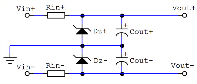Na rysunku poniżej, znajduje się podstawowy układ stabilizacji napięcia, oparty o pojedynczą diodę zenera. Jest to bardzo prosty układ z wieloma wadami i nie zapewnia on odpowiedniego tłumienia tętnień, jest mocno zależny od prądu obciążenia, a sama stałość  napięcia, pozostawia wiele do życzenia. W tej wersji stosowany był w Yamaha A-1000, A-1020, AX-900 oraz modelach A-700 czy A-720 i innych.