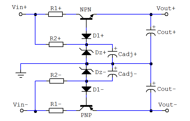 Rozwinięciem układu z pojedynczą diodą zenera, jest układ z tranzystorem szeregowym, dla którego dioda zenera stanowi napięcie odniesienia, podawane na bazę tranzystora. Układ jest znacznie bardziej niezależny od obciążenia i wydajniejszy prądowo. Zastosowanie kondensatora CADJ , równolegle do diody zenera, mocno poprawia parametry stabilizacji. W praktyce można spotkać też, równolegle z diodą zenera, mały kondensator stały, rzędu 100nF, który redukuje szumy diody zenara, których w kierunku zaporowym, generuje sporo. Układ, mimo że jest znacznie lepszy, nie jest idealny. Pozbawiony jest jakiejkolwiek kontroli napięcia wyjściowego, jaką realizują układy ze sprzężeniem zwrotnym. np. scalone stabilizatory napięcia. Układ z rysunku, to dokładny układ stabilizacji z Rotela RA-980BX.