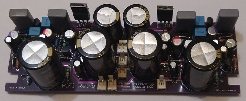 Kolejnym rozwinięciem jest nowa płyta głównego zasilacza. Niby nic takiego, ale rozdziela zasilanie końcówek prądowych dla obu kanałów i co chyba najważniejsze, umożliwia prawdziwą renowację tych wzmacniaczy z wymianą głównych elektrolitów ale z zastosowaniem 2 par kondensatorów SNAP-IN o średnicy do 35mm. Można wybierać i przebierać... Mundorf M-Lithyc, Nippon KMH czy SMH, świetne Kemet ALC10S SlitFoil (to jeszcze autorski produkt BHC Aerovox), Cornell Dubilier sierii 380LX i wiele innych w różnym zakresie cenowym... Dla tych z Was, których yamaszki grają już bez basu i ostro, można po tanioniości wstawić kondensatory mniejszej pojemności np. 6800uF (x 2) dla przykładu serii SLPX produkcji CDE za niewiele ponad 80zł za komplet, co zapewne przekona Was, że te modele kiedyś naprawdę dobrze grały i warto je restaurować. Tę modyfikację można zastosować niezaleźnie od pozostałych, bez żadnych przeróbek i jak to u mnie, pasuje w fabryczne miejsce bez żadnych pająków i kombinacji.