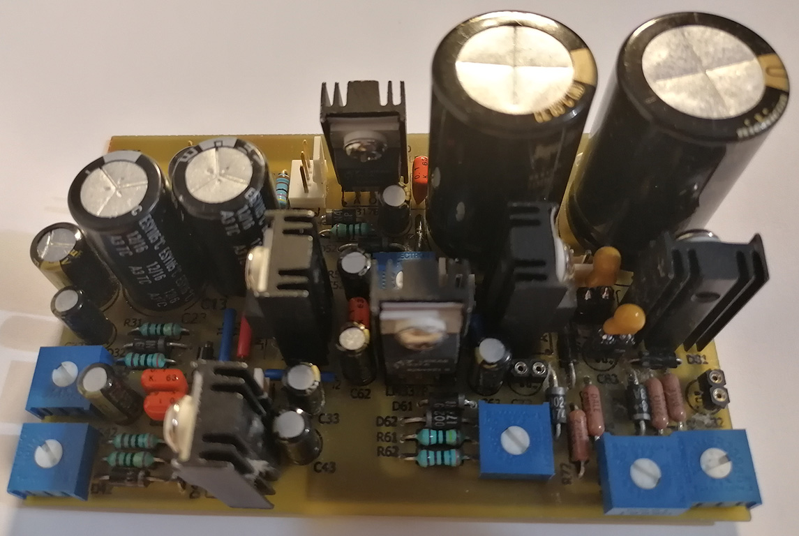Jest to już 3 wersja modułu stabilizacji napięcia, do zasilania mojego wzmacniacza. W tej wersji zawiera 2 osobne stopnie stabilizacji +/- 22V do zasilania wzmacniaczy różnicowych końcówek mocy. Zastosowałem 2 osobne moduły, gdyż rozdzieliłem całkowicie zasilanie tych stopni dla kanału lewego i prawego, co poprawiło separację kanałów (częściowe dual-mono). Druga para kondensatorów wyjściowych znajduje się w oryginalnym miejscu na płycie przedwzmacniacza phono. Znajduje się tu także kolejny stopień stabilizacji +/- 16V do zasilania przedwzmacniacza.