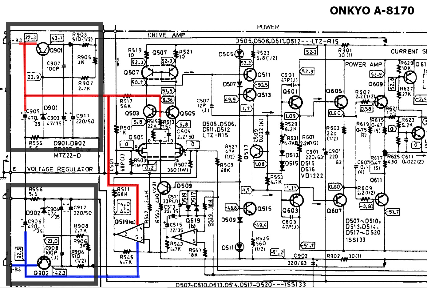 Widzimy, że cała sekcja przedwzmacniacza gramofonowego, zasilana jest z tego układu. Ale gdy nie słuchacie płyt winylowych, czy warto go ulepszać? Ten model kompletnie pozbawiony jest przedwzmacniacza, a całość wzmocnienia realizuje końcówka mocy. Układ korekcji tonów, oparty na elementach pasywnych i wpięty jest w sprzężenie zwrotne samej końcówki. Tutaj więc nie ma żadnego pola do poprawy. Widzimy jednak, że wejściowy wzmacniacz różnicowy, końcówki mocy, zasilany jest też z tego źródła napięcia. I tu jest potencjał do działania! To bardzo ważna część układu i jakość dźwięku, bardzo zależy od tego stopnia, dlatego jego poprawa, da wymierne korzyści. Nieco inaczej sprawa ma się, jeśli chodzi o Yamahę A-1000, której pary różnicowe, zasilane są w podobny sposób (w szerszym zakresie), ale mamy również, przedwzmacniacz oparty o wzmacniacze operacyjne oraz układ dc servo, również na op-ampach. Wzmacniacze operacyjne, są elementami, dla których, jakość zasilania jest szalenie istotna. Tak więc, skala poprawy jakości, dla Yamahy A-1000 będzie naprawdę duża. Co więcej, uważam, że nie ma co nawet "bawić" się w podmianki op-ampów, bez wcześniejszego zadbania o dobre zasilanie dla nich. Podobne możliwości poprawy, daje Yamaha AX-900, która mimo, że nie tak złożona konstrukcyjnie jak A-1000, to zawiera prosty przedwzmacniacz i aktywny układ korekcji tonów oraz częściowo stabilizowane napięcie zasilania pary różnicowej, a ma ten sam, prosty układ stabilizacji.