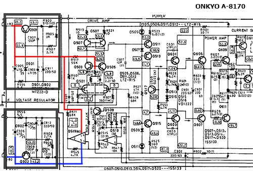 Innym wzmacniaczem zintegrowanym, posiadającym niemal identyczny układ stabilizacji jest np. Onkyo A-8170. Tradycyjnie, stabilizowane napięcie, wykorzystywane jest do sekcji przedwzmacniacza phono. Jednak mimo, że wzmacniacz pozbawiony jest jakiegokolwiek przedwzmacniacza, to stabilizowane napięcie, zasila też źródło prądowe dla pary różnicowej i wzmacniacze operacyjne, sekcji wejściowej i sprzężenia zwrotnego wzmacniacza, a więc również mamy możliwość poprawy walorów brzmieniowych, przez ulepszenie układu stabilizacji i poprawę warunków napięciowych.