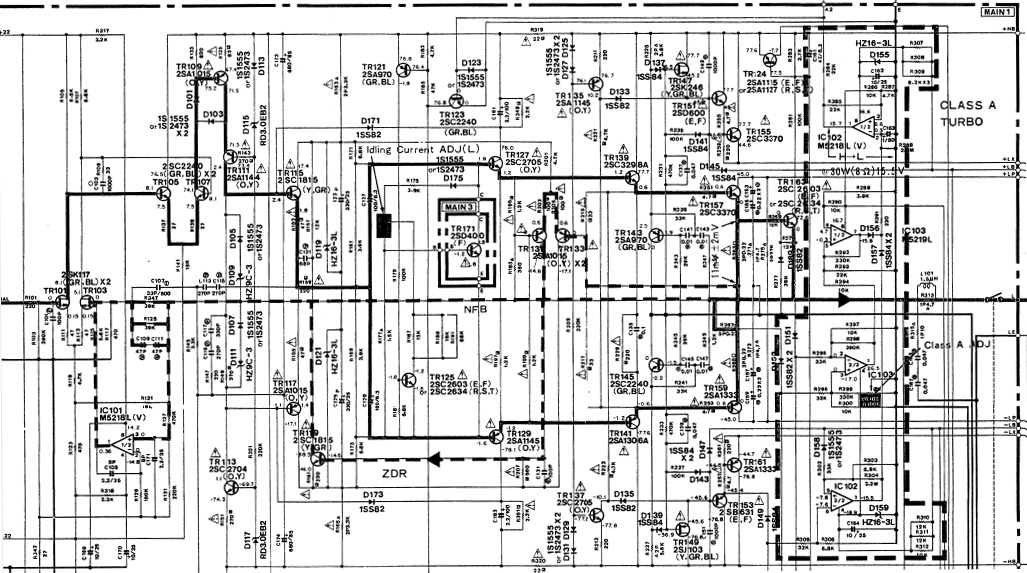 Dzięki temu tranzystory te pracują przy mniejszym napięciu kolektor-emiter i moc strat jest zredukowana. Ale rolą tego układu jest także zapewnienie dodatkowego prądu z drugiej „baterii” głównych kondensatorów zasilacza, wtedy gdy jest taka potrzeba. Zapewnia to bardzo dobrą wydajność prądową końcówki mocy w szczytach sygnału. Ponadto, wzmacniacz wyposażony został w bardzo dobrze opracowany układ DC Servo, kasujący napięcie stałe na wyjściu. Dzięki temu uniknięto konieczności stosowania kondensatora w torze sygnału sprzężenia zwrotnego, co jest bardzo pożądane. Całość okraszona jest układem ZDR (Zero distortion rule) opracowanym przez Yamahę, a mającym za zadanie redukcję zniekształceń (również tych tzw. przejścia przez zero") powstałych w stopniach prądowych. Odbywa się to przez coś na zasadzie dodatkowego sprzężenia zwrotnego, gdzie para różnicowa „wyłapuje” błędy wzmocnienia sygnału w sekcji prądowej na wyjściu wzmacniacza, a sygnałem z wcześniejszego stopnia wtórników. Korekcja sygnału uzyskana jest przez odpowiedni wpływ na główne sprzężenie zwrotne.